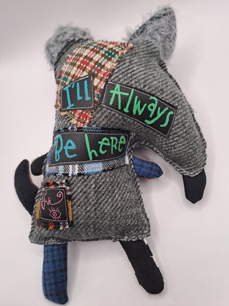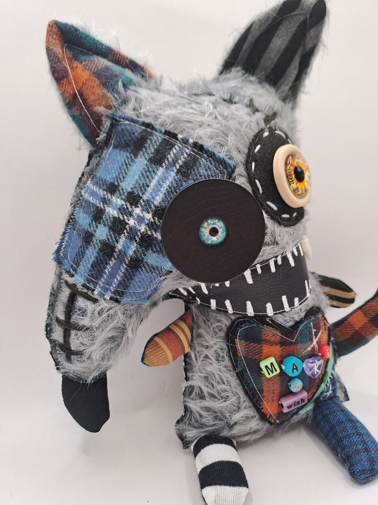 Measures 11" length. Made of new and recycled fabrics, clay details and acrylic paint.