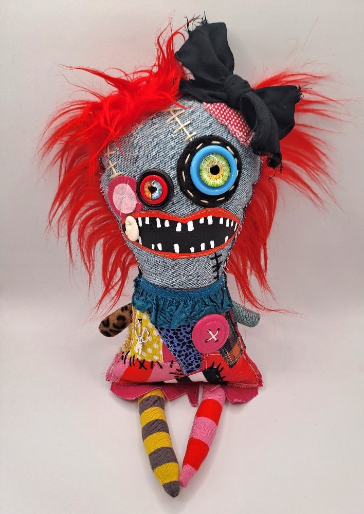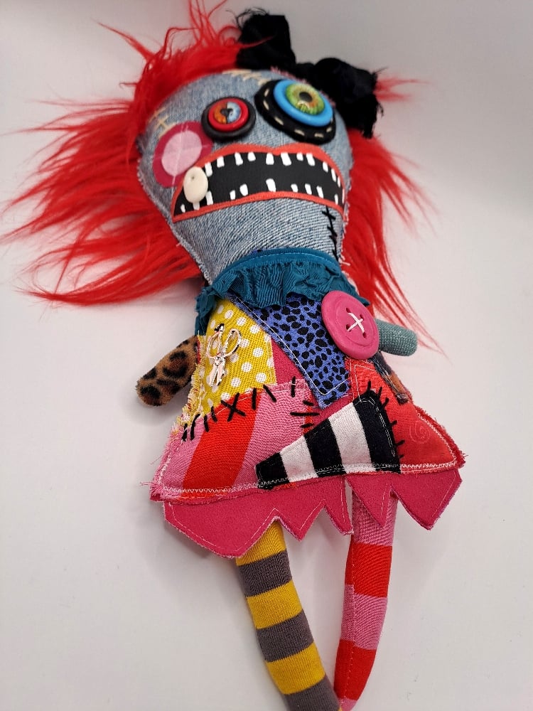 Made of new and recycled fabric, clay details and acrylic paint.